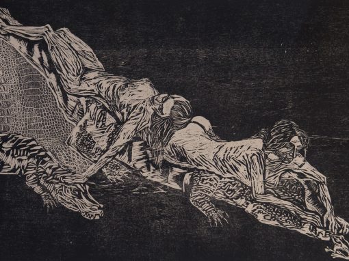 Na FLAC Olívia Viana apresenta trabalhos em diversas linguagens: xilogravura, desenho,  aquarela, pintura e foto performance. Todas as obras se voltam para a temática de pele, transformação e animalidade.